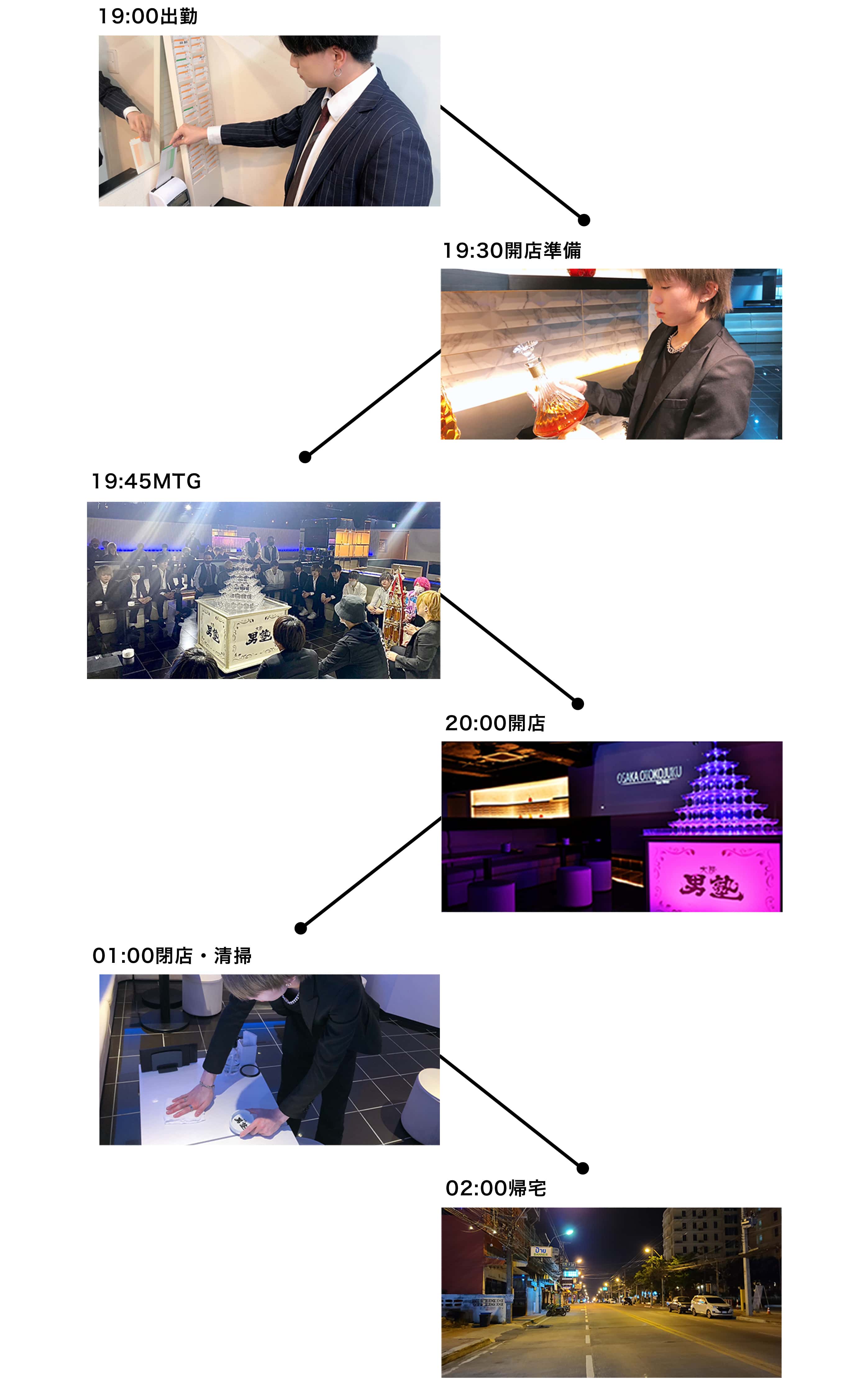 面接を担当してくれる方、新人スタッフを研修して下さる方、求人及びIT担当の方、集客担当の方、ホストとして売上を上げる為に必要な研修をしてくれる方、そして日々の連絡窓口の方など、各担当者が個別にいて下さるため、すべての面において優れたサポートを受けられます。